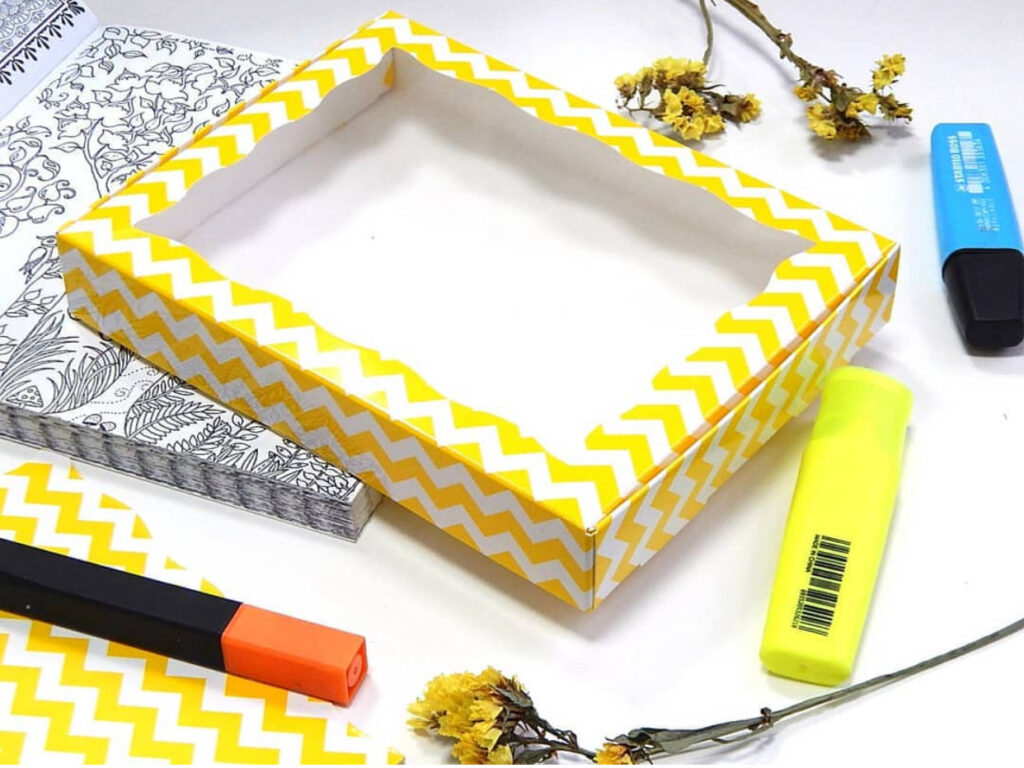 Коробка 200*150*30 мм “Зігзаг” жовта з крейдованого картону з віконцем